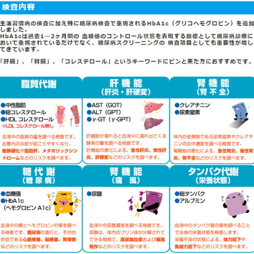 生活習慣病の中でも特に糖尿病に焦点を当て、 ヘモグロビンA1cを追加した商品です。