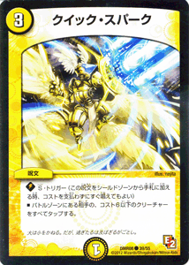 デュエルマスターズ カード エピソード2 第4弾 グレイト・ミラクル(DMR08)収録 デュエルマスターズ カード クイック・スパーク ■レアリティ:コモン ■種類:呪文 ■文明:光文明 ■コスト:(3) [特殊能力] シールドトリガー バトルゾーンにある相手の、コスト6以下のクリーチャーをすべてタップする。